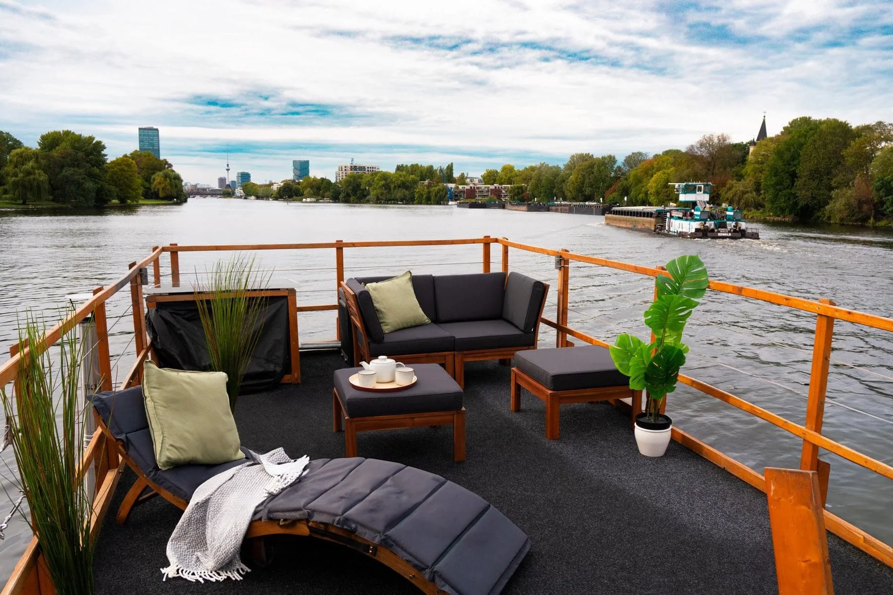 Nach dem Saunagang lädt unsere großzügige Dachterrasse zum Verweilen ein: Kuschelt euch mit einer Decke auf die bequemen Liegen oder das Sofa und genießt den Blick auf die funkelnden Lichter der Stadt. Ein erfrischender Sprung in die Spree rundet euer Erlebnis ab – eine romantische Auszeit, die ihr so schnell nicht vergessen werdet.